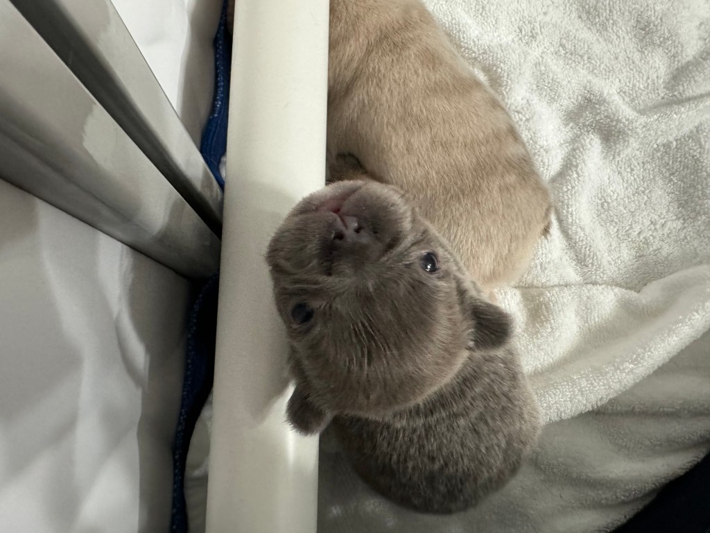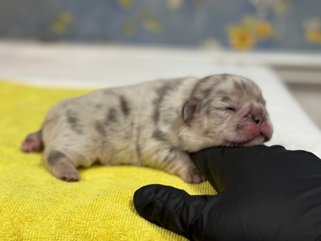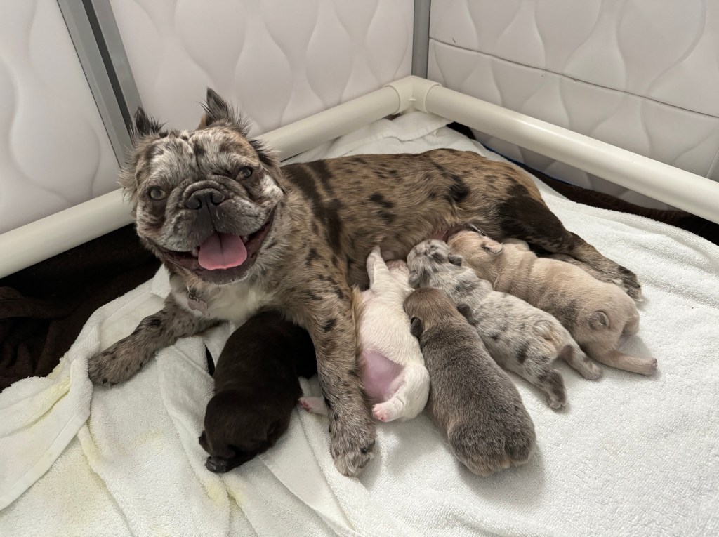 French Bulldog litter with potential fluffies. Three girls and two boys, born March 14. One girl is solid chocolate. One girl is platinum. One girl is fawn, merle. One boy is blue with tan. And, one boy is lilac and tan, merle. All are fluffy carriers.