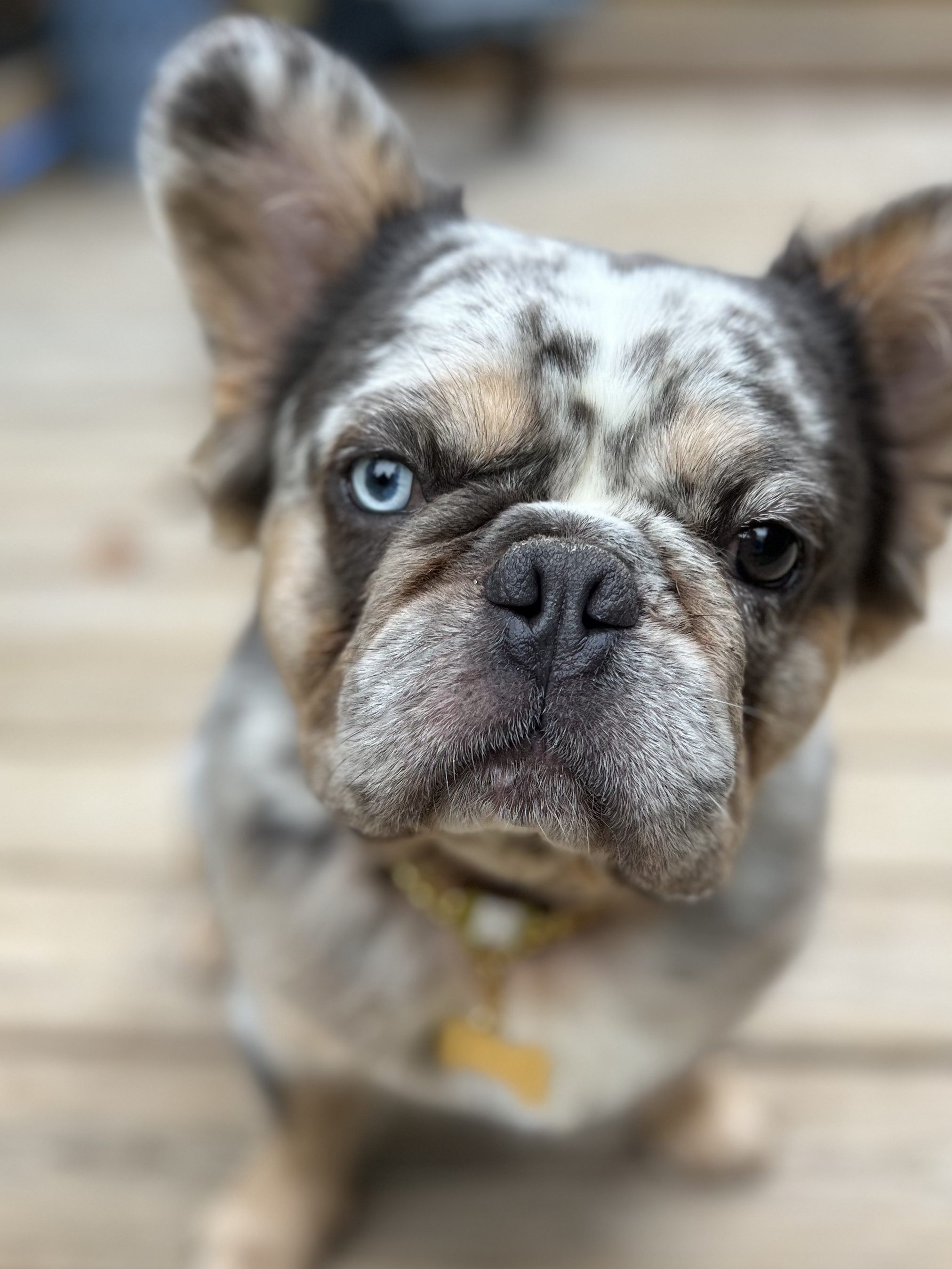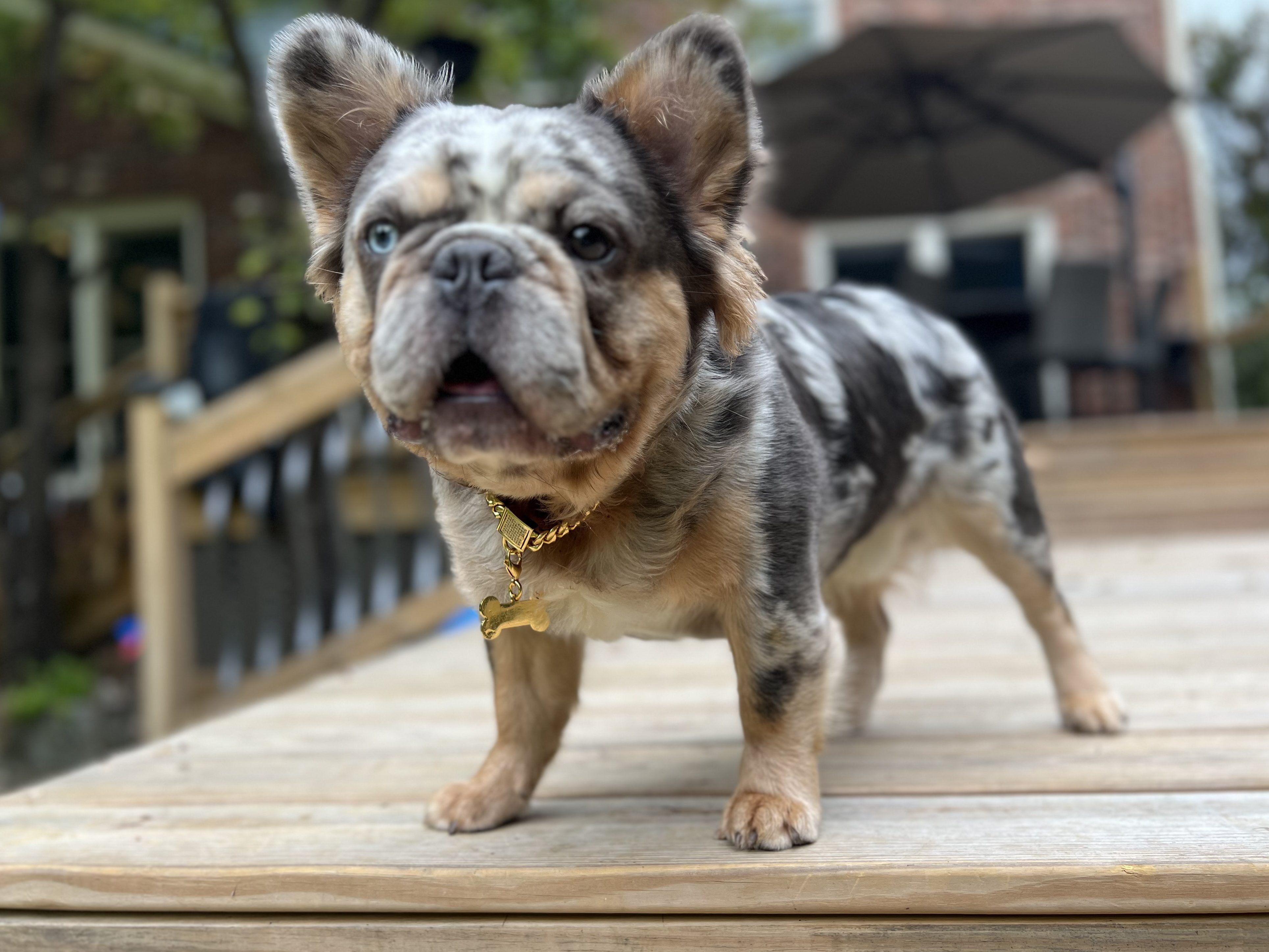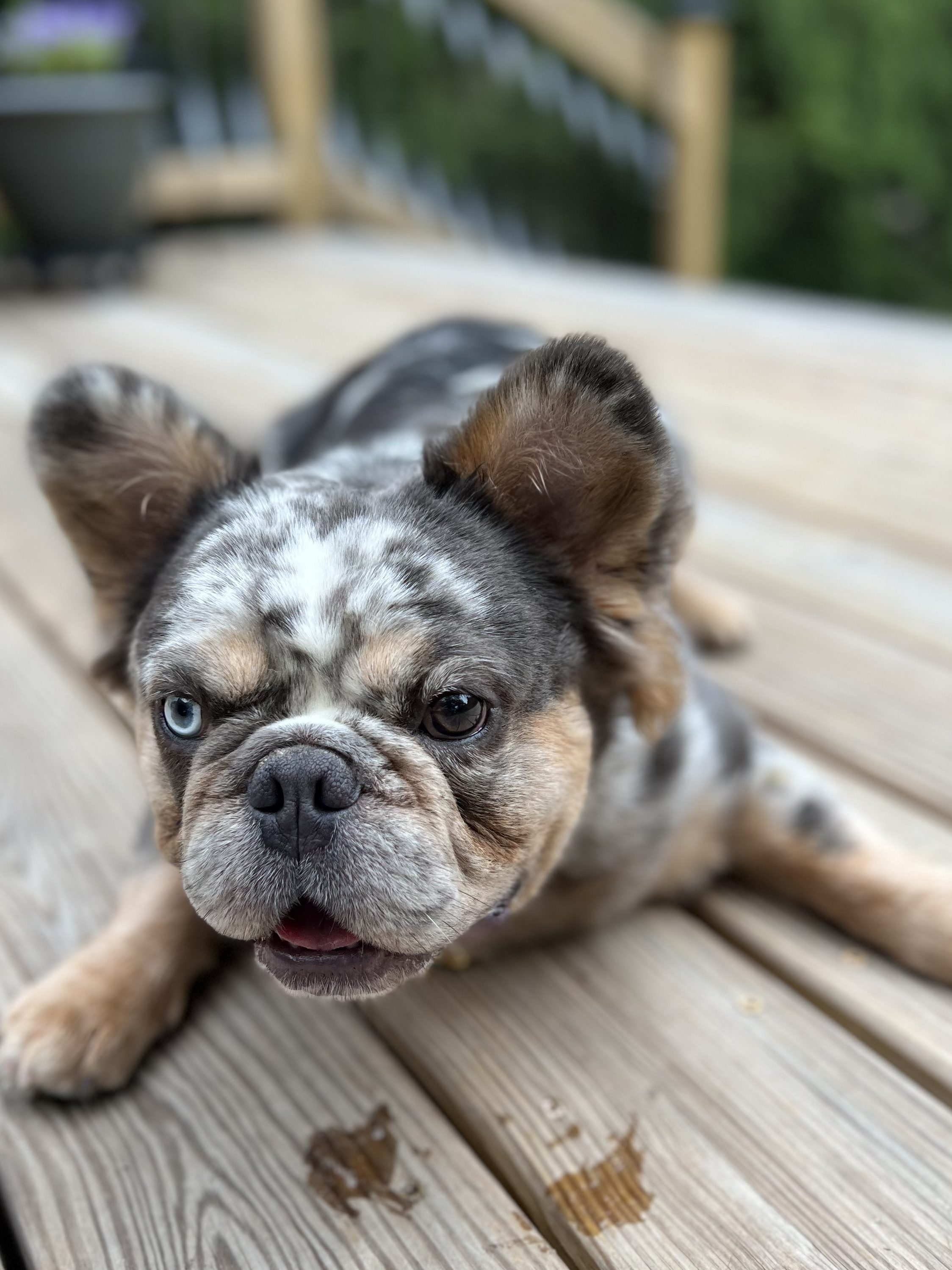Meet Duke, one of our studs whose chill disposition and striking features make him the perfect addition to your breeding endeavors. He has a fantastic build: compact, short legs, small ears and striking eyes, Duke’s visual appeal is undeniable. He is a blue and tan merle visual fluffy, carrying cocoa and cream. His grandsire is the world famous Mormon.